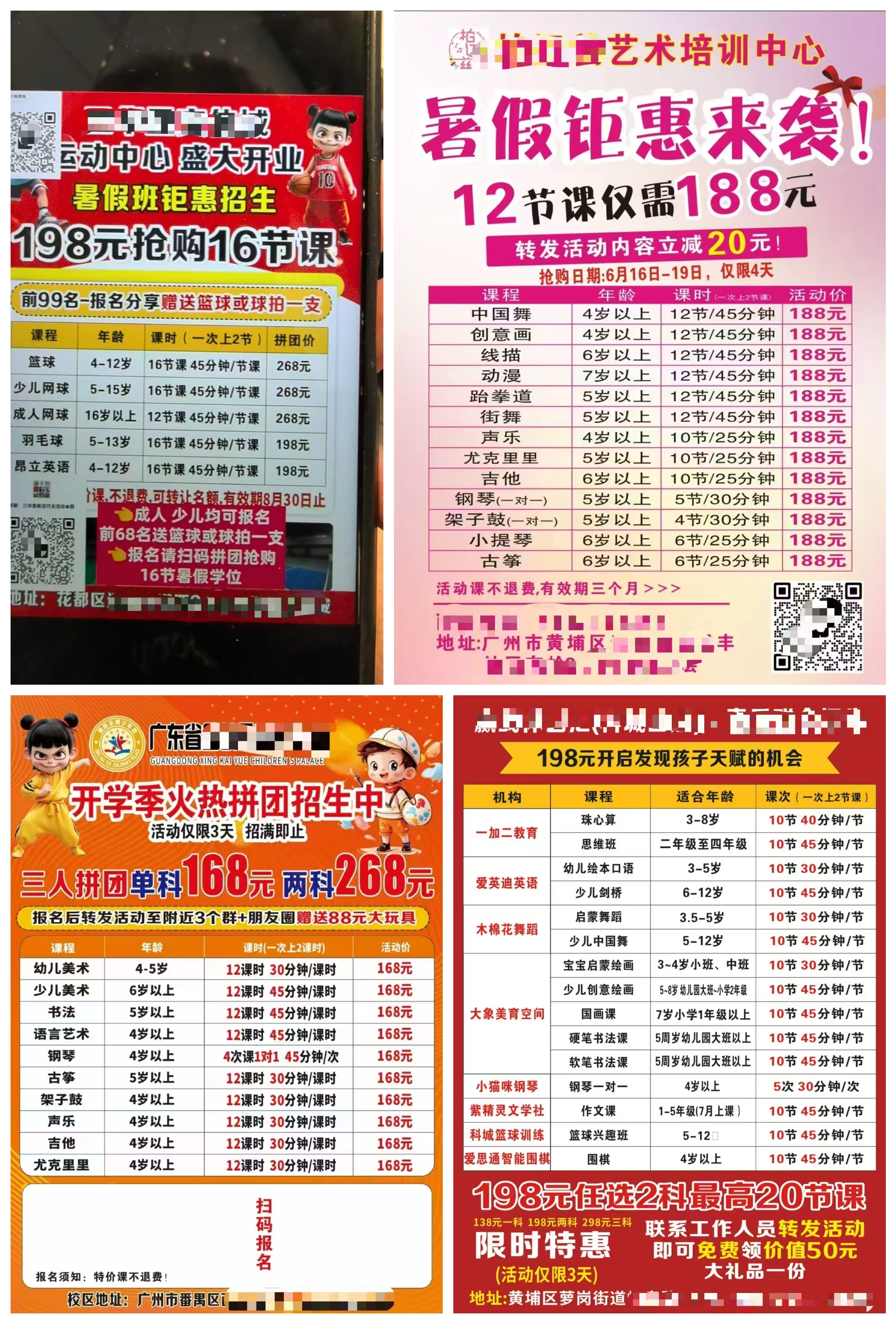 这些培训班基本以艺术与体育为主,168元12节课的非常多,还要送球送衣服等礼品。而那些地推团队开始是在学校门口拉人,假期后则是在菜市场、公园等地到处送礼品,称用一餐饭钱就能开启一个发现孩子天赋的机会。